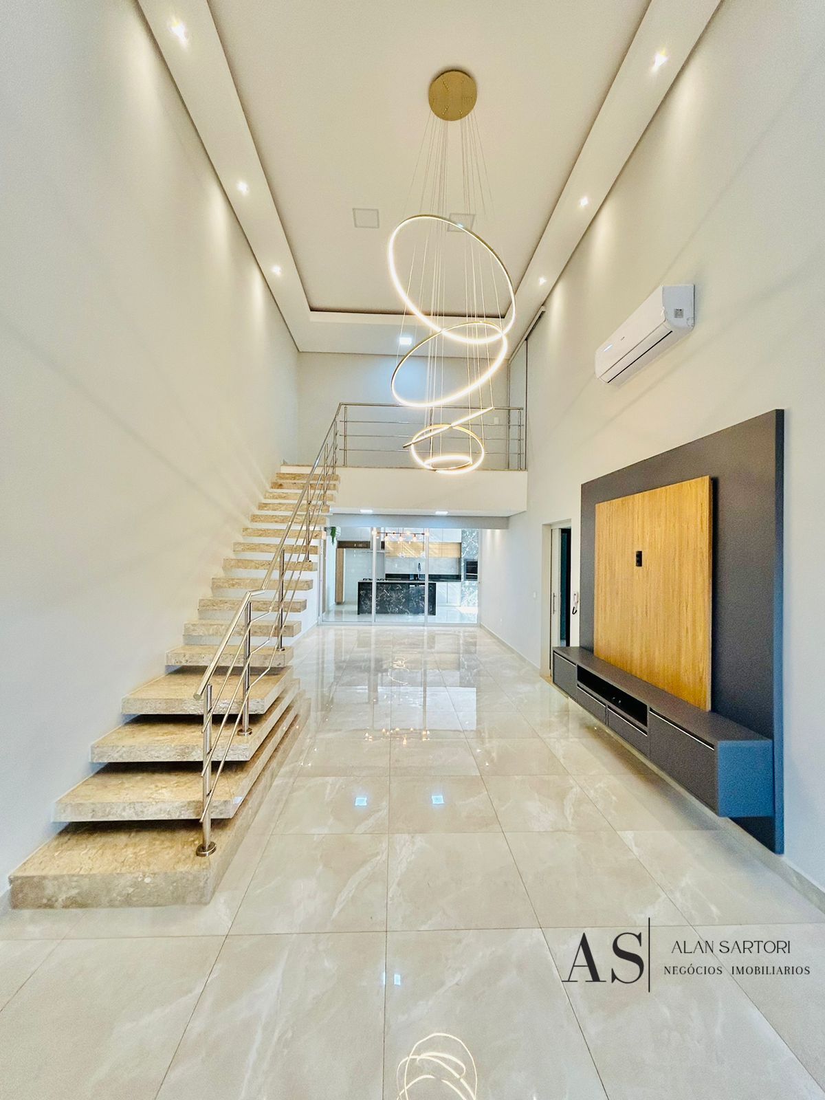 Sala para dois ambientes com painel de tv, rica em iluminação de led e lustres, pé direito alto;